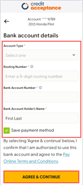 Add the required debit card and/or bank account details, ensure the box next to Save payment method is checked, and click Agree & continue.