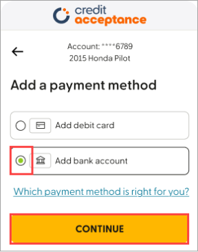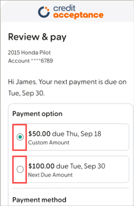 We offer several convenient payment options for making your monthly payment. To view the options, click here, go to http://www.creditacceptance.com/make-a-payment, or log in to your Customer Portal account in the Mobile App and click Make a Payment.