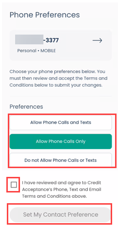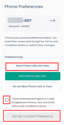 Click the desired phone preference option under Preferences, check the box after reviewing to agree to Phone, Text, and Email Terms and Conditions, and click Set My Contact Preference.