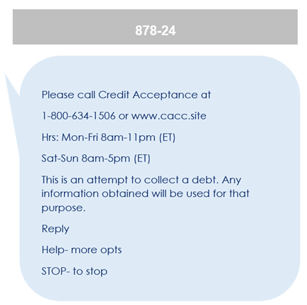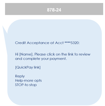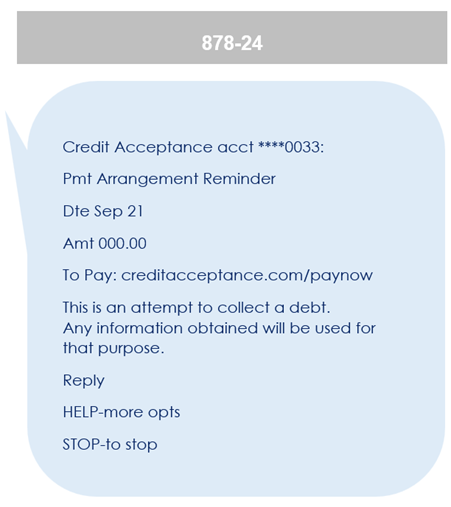 - The messages customers may receive include relevant account information and updates, standard monthly payment reminders, payment promise reminders, AutoPay payment reminders, and requests to call Credit Acceptance.