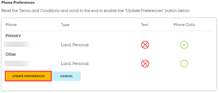 Note: You must scroll to the end of the Terms and Conditions to enable the UPDATE PREFERENCES button.