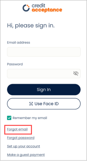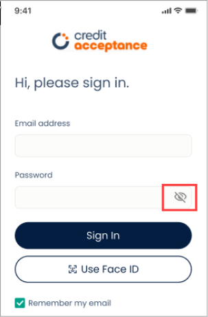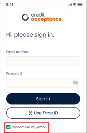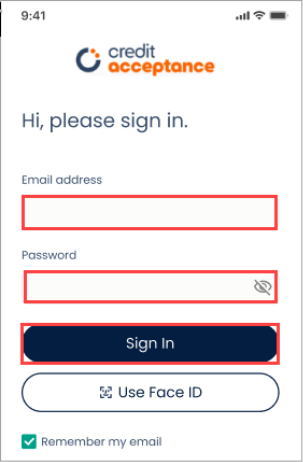 Open the Credit Acceptance Mobile App and complete the Email address and Password fields, then click the Sign In button, or use biometrics to log in.