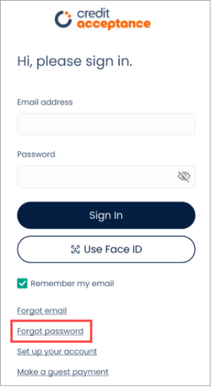 Open the Credit Acceptance Mobile App and click the Forgot password? link.