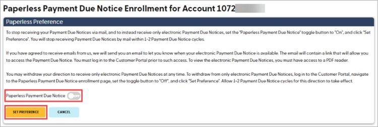 Set the Paperless Payment Due Notice toggle button to On and click the SET PREFERENCE button.